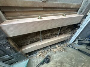 既存の梁を防蟻剤による処理をした後に新設の梁を既存の梁の上下に設置し、ボルトで緊結する処理を行いました。